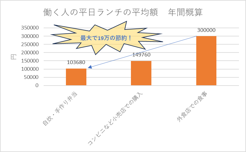 つまり…仕事がある日をひと月あたり20日と仮定したとき、外食に頼りきりだと年間約30万、コンビニ弁当頼りだと年間で約15万かかりますが、自分で作るようになれば年間10万程度にまで食費を抑えられるということ